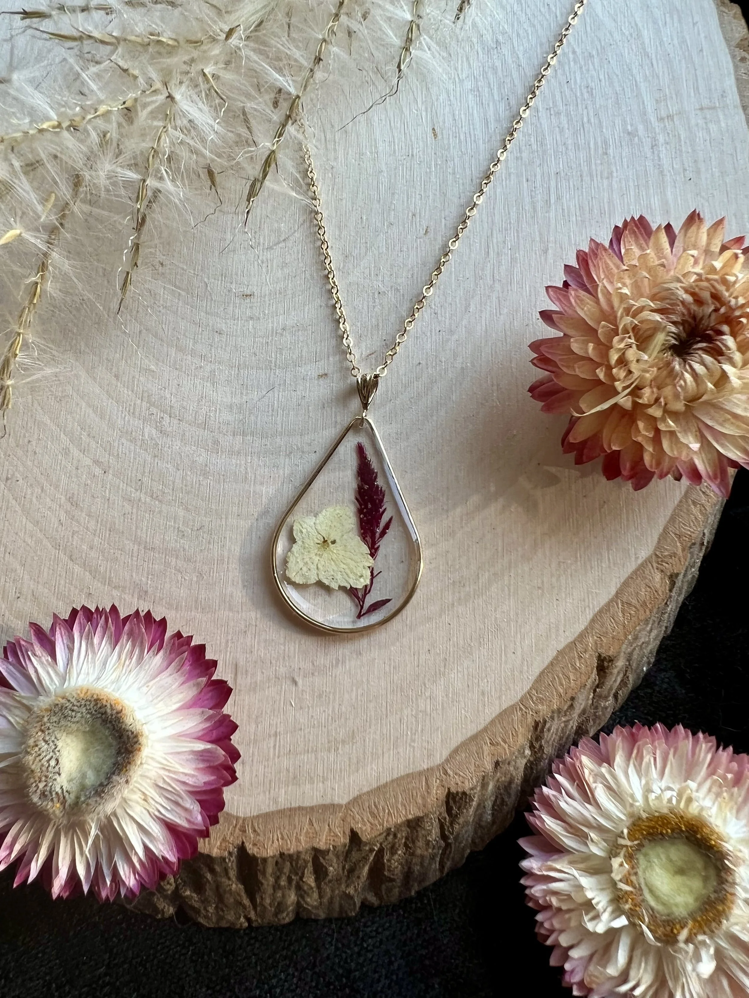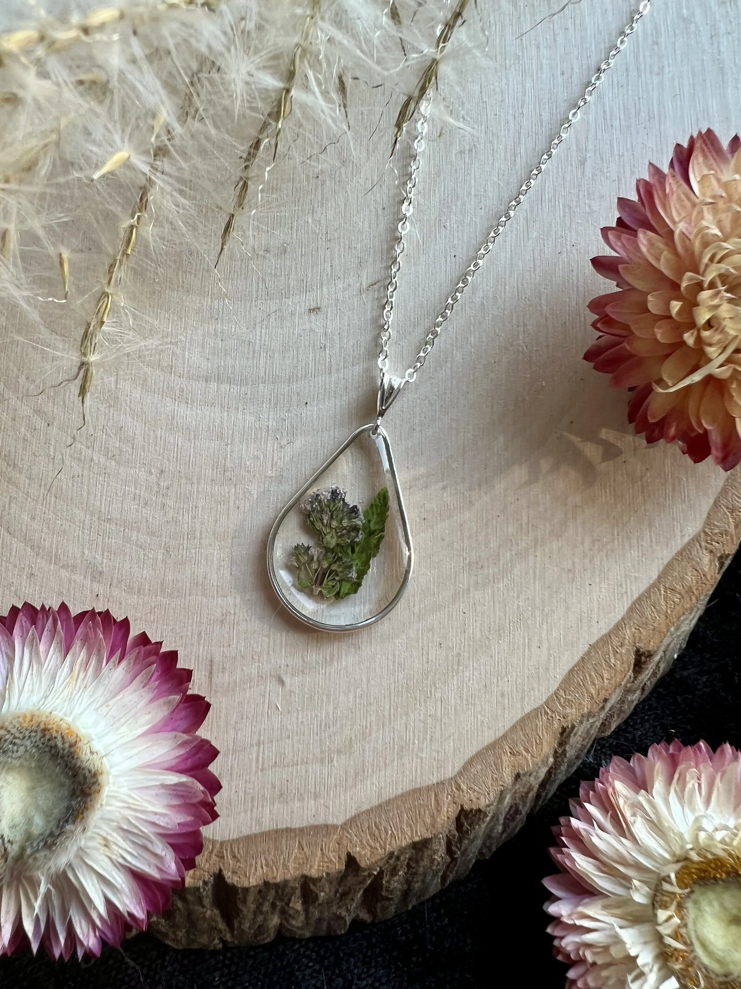 Select the metal, style, and necklace length you want. If your flowers aren’t small enough, we will create a flower “confetti.”