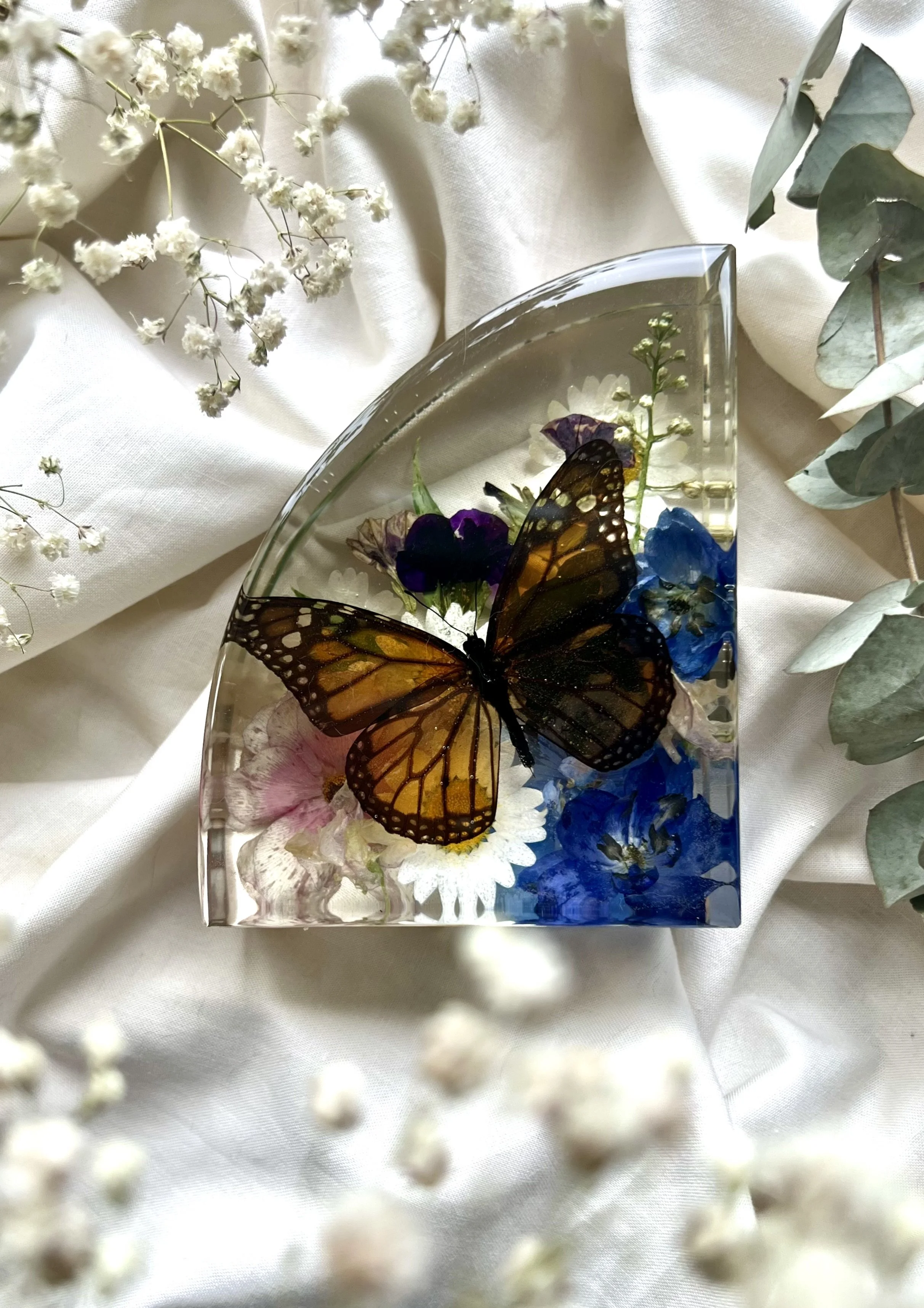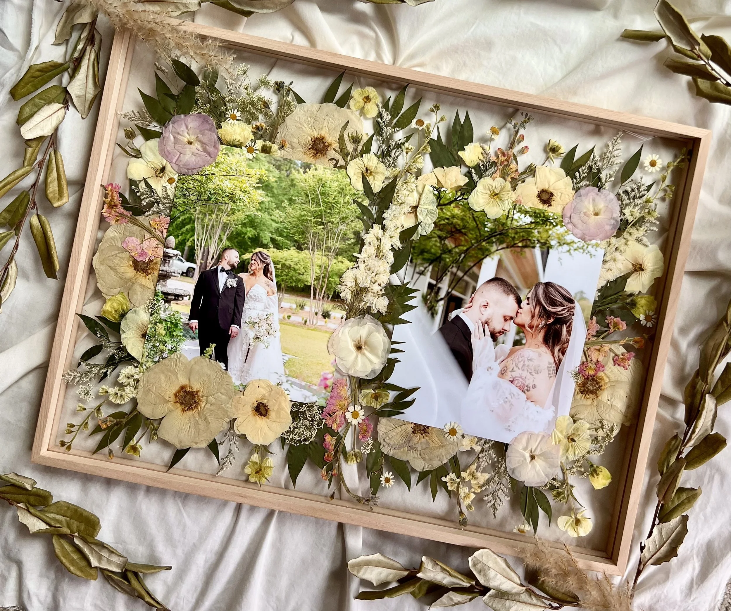 Floral frames are our only hanging displays. These pieces require each flower to be pressed flat. Let us know if you want to include a photo or invitation in your frame.