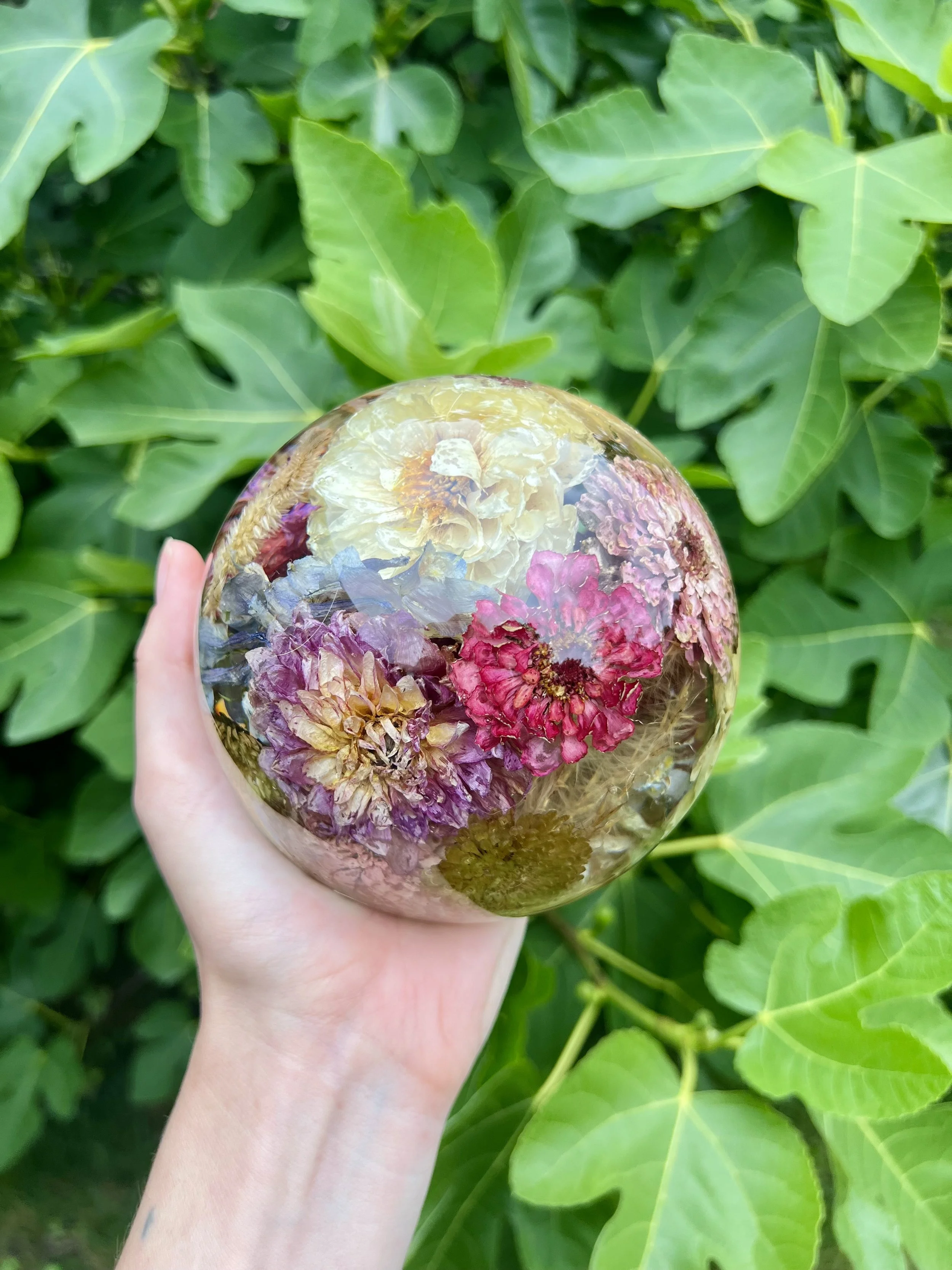 This standing sphere has a flat bottom and makes a great display. This sphere will hold several large flowers and accents from your bouquet.